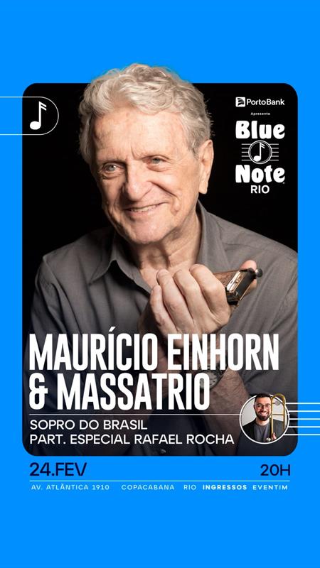 Ingressos: de R$ 60 a R$ 120, vendas pelo site https://www.eventim.com.br/artist/blue-note-rio/mauricio-einhorn-massa-trio-sopro-do-brasil-part-especial-rafael-rocha-4085072/